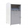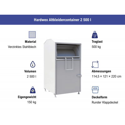Mehr lesenRobuster Container aus grau pulverbeschichtetem, verzinktem Stahlblech zur Sammlung von Textilien, Schuhen und Spielzeug. Volumen: 2 500 l, Höhe: 2 200 mm, Breite: 1 145 mm, Tiefe: 1 210 mm.