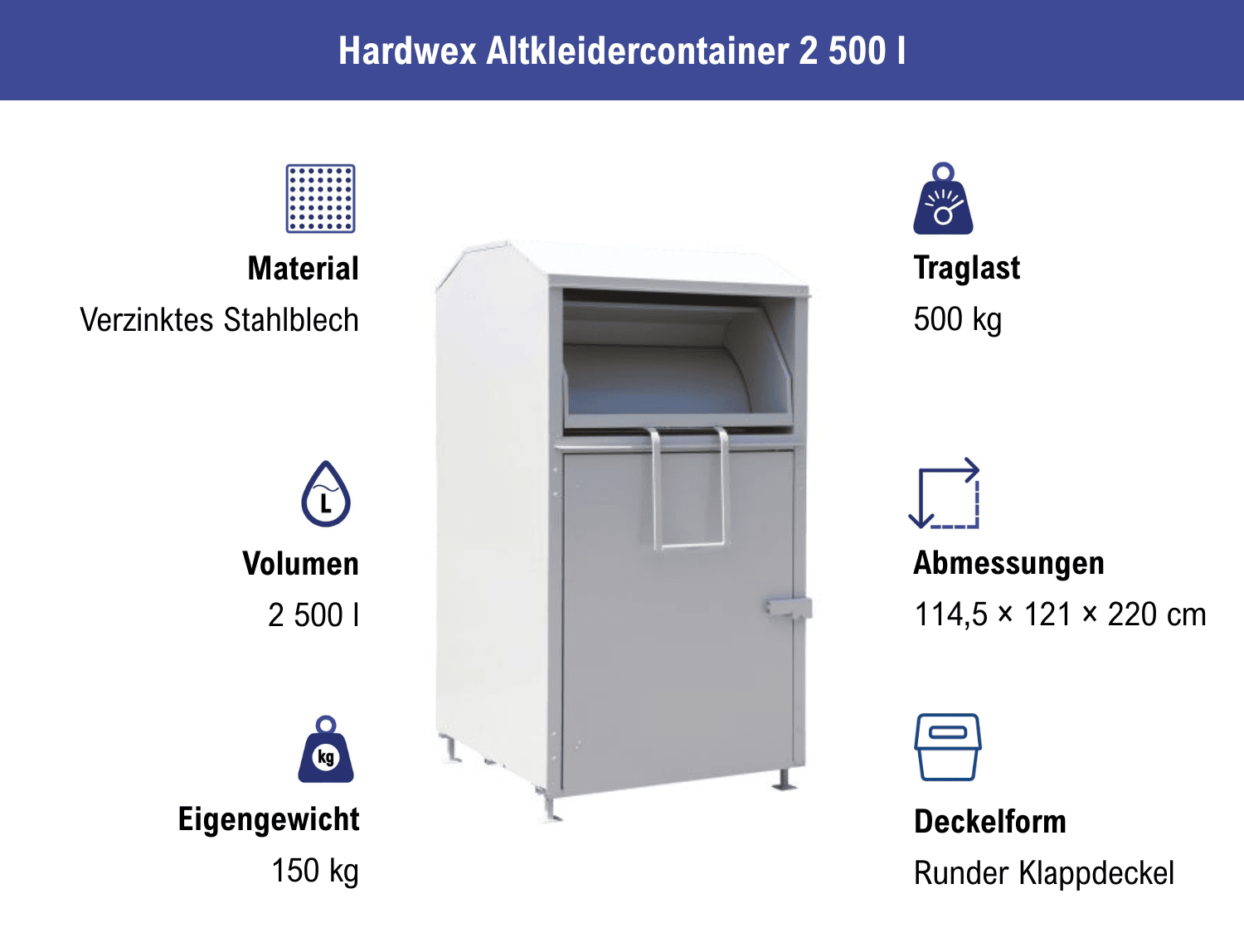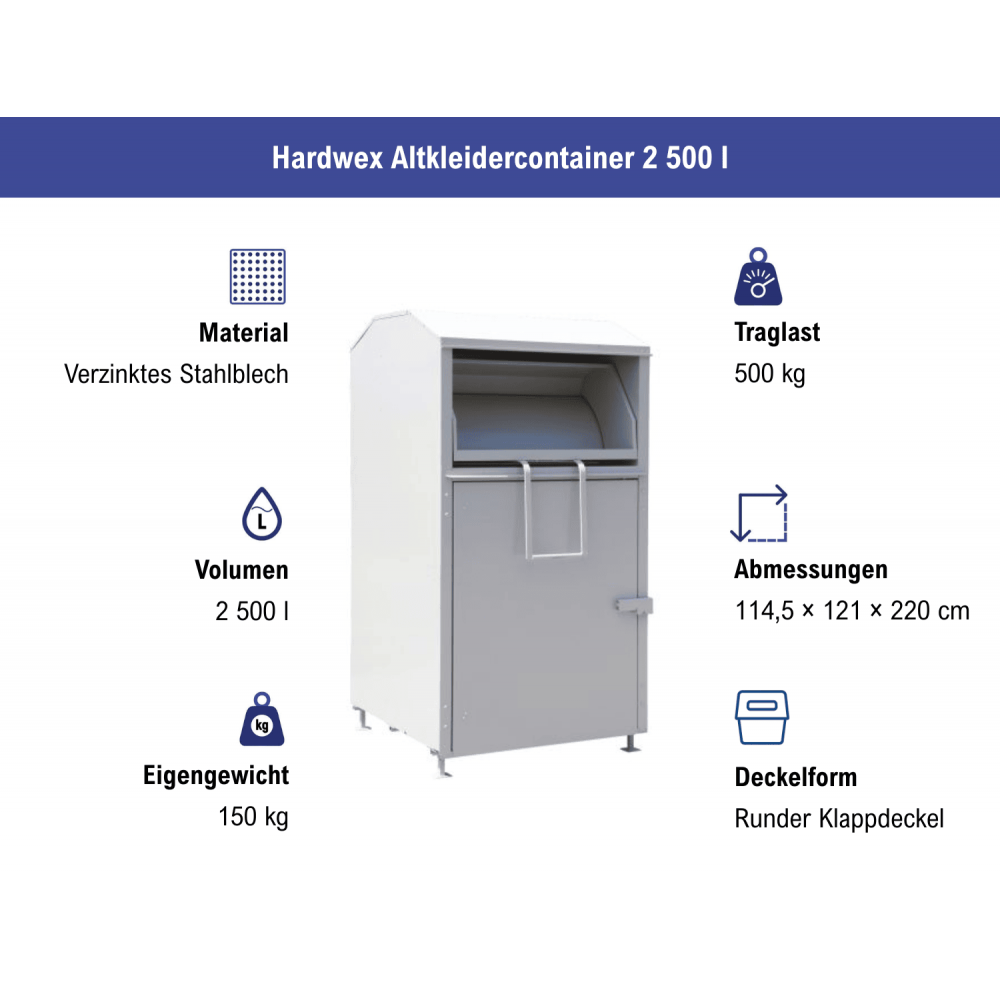 Mehr lesenAltkleidercontainer mit einem Volumen von 2 500 Litern (Traglast 500 kg) zur Sammlung und Wiederverwertung von Kleidung, Schuhen und Spielzeug – ideal für Kommunen, gemeinnützige Organisationen und Wertstoffhöfe. Gefertigt aus grau pulverbeschichtetem, verzinktem Stahlblech (1 mm stark) – witterungs- und vandalismussicher.