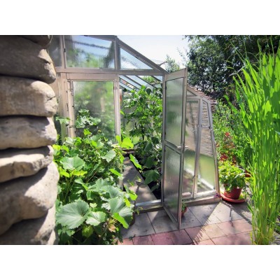 Anlehngewächshaus aus robustem, feuerverzinktem Blech mit Lackierungsoption (5 Farben). Höhe 2,22 m, Breite 2,12 m, Länge 4,52 m (Fläche 9,58 m2).