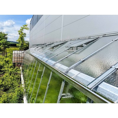 Durch das hohe Konstruktionsgewicht widersteht das Gewächshaus Windgeschwindigkeiten bis 120 km/h und Schneelasten bis 150 kg/m2. Der Bau hat schräge Wände und ein Pultdach.