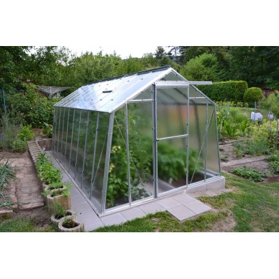 Gewächshaus aus robustem, feuerverzinktem Blech ohne Lackierung. Höhe 2,02 m, Breite 2,47 m, Länge 8,89 m (Fläche 21,96 m2). Windbeständigkeit bis 120 km/h mit 10 Jahren Korrosionsgarantie. Einfache Montage. Inklusive Schiebetür, 5× Dachfenster mit automatischer Öffnung, 1× Fenster in der Rückwand, beidseitige Regenrinne und Halterungen zur Montage eigener Regale im Gewächshaus.
