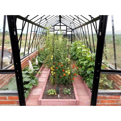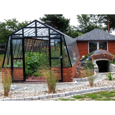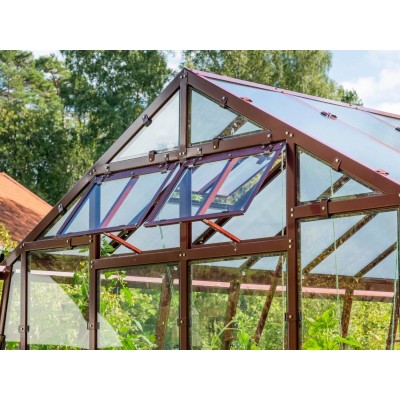 Gewächshaus aus robustem, feuerverzinktem Blech mit Lackierungsoption (5 Farben). Höhe 2,09 m, Breite 3,03 m, Länge ab 3,03 m (Fläche 9,18 m2). Windbeständigkeit bis 120 km/h mit 10 Jahren Korrosionsgarantie. Einfache Montage. Inklusive Doppelflügeltür, 2× Dachfenster mit automatischer Öffnung, 2× Fenster in der Rückwand, beidseitige Regenrinne, Aufhängehaken für Pflanzen und Halterungen zur Montage eigener Regale im Gewächshaus.