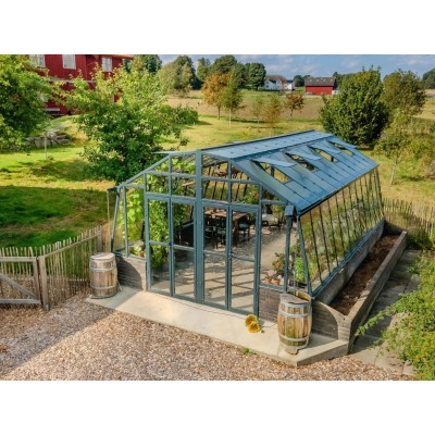 Gewächshaus aus robustem, feuerverzinktem Blech mit Lackierungsoption (5 Farben). Höhe 2,22 m, Breite 4,24 m, Länge 7,51 m (Fläche 31,84 m2). Windbeständigkeit bis 120 km/h mit 10 Jahren Korrosionsgarantie. Einfache Montage. Inklusive 2× Doppeltüren an jeder Stirnwand, 10× Dachfenster mit automatischer Öffnung, beidseitige Regenrinne, Aufhängehaken für Pflanzen und Halterungen zur Montage eigener Regale im Gewächshaus.