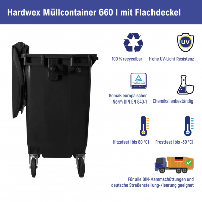 Mehr lesenSchwarzer Müllcontainer 660 l von Hardwex mit braunem Flachdeckel für bis zu 264 kg Biomüll, geeignet für Mietshäuser, Gemeinden und Unternehmen. Er ist witterungsbeständig, bruchsicher, leicht zu reinigen und einfach zu handhaben.
