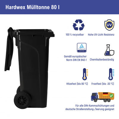 Mehr lesenMülltonne 80 l von Hardwex in Schwarz für bis zu 33 kg Restmüll, geeignet für ein Einfamilien- und Ferienhäuser oder Unternehmen. Sie ist witterungsbeständig, bruchsicher, leicht zu reinigen und einfach zu handhaben.